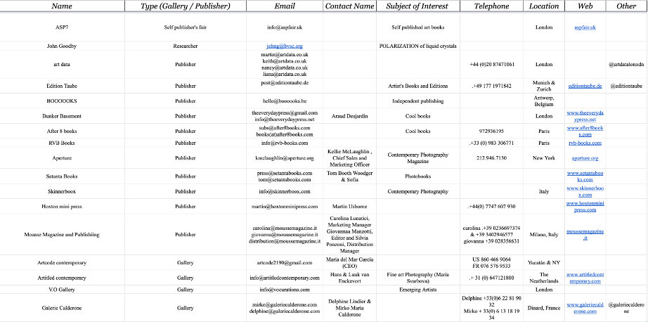 Since then, I have also continued updating a database I built to track different artists, galleries, publishers and researchers. I find the process of tracking applications and submissions difficult, so I am working on ways I can find a visual scheme to organize them to make that task easier. For mi it’s interesting that researchers whose papers and research are difficult for me to understand are harder to approach, but I believe maybe there could be aspects they are interested in that I can help with.